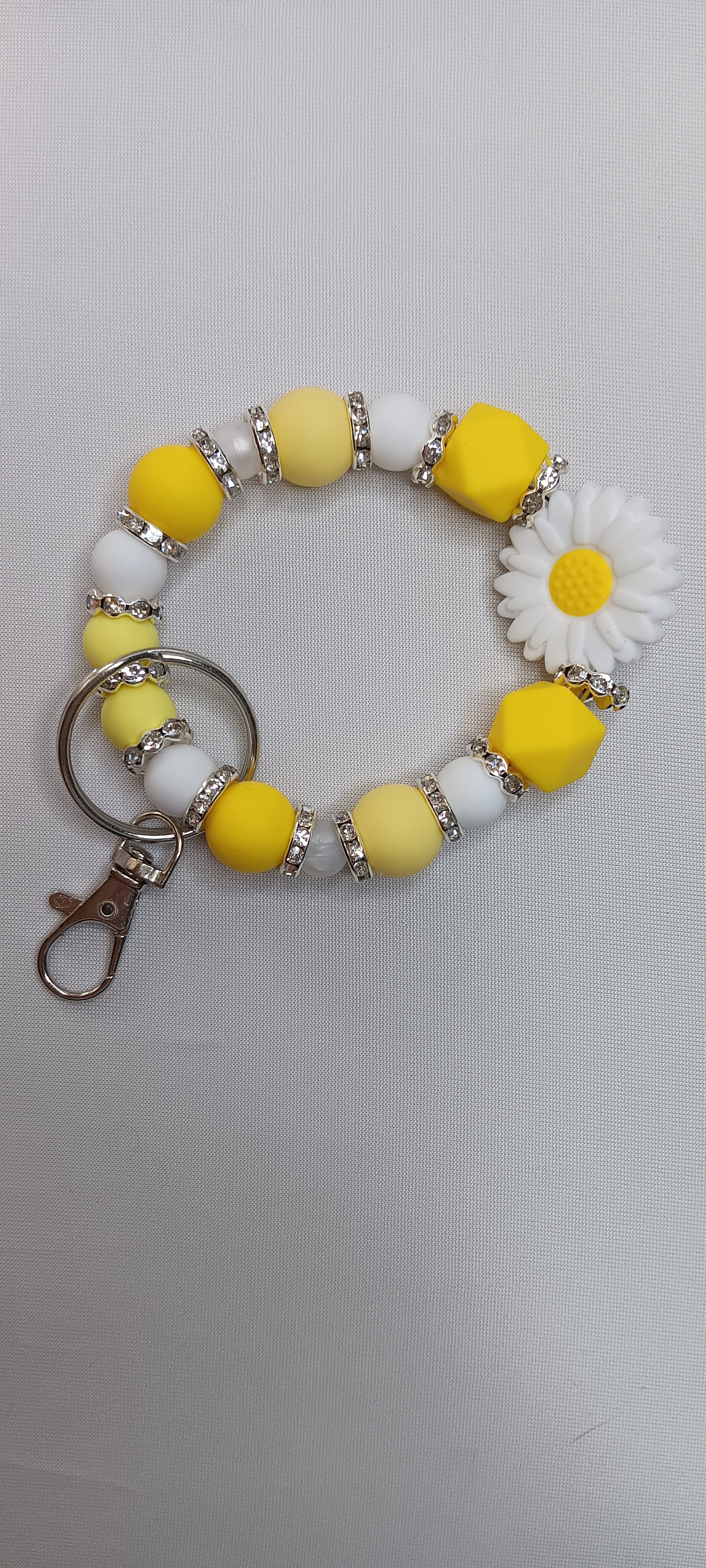 The Bling Daisy wristlet is a stylish and functional accessory. Made with silicone beads in daisy design, it also features bling spacers and a flower bead. The perfect addition to any outfit, the wristlet is durable and eye-catching. Elevate your style with the Bling Daisy wristlet.