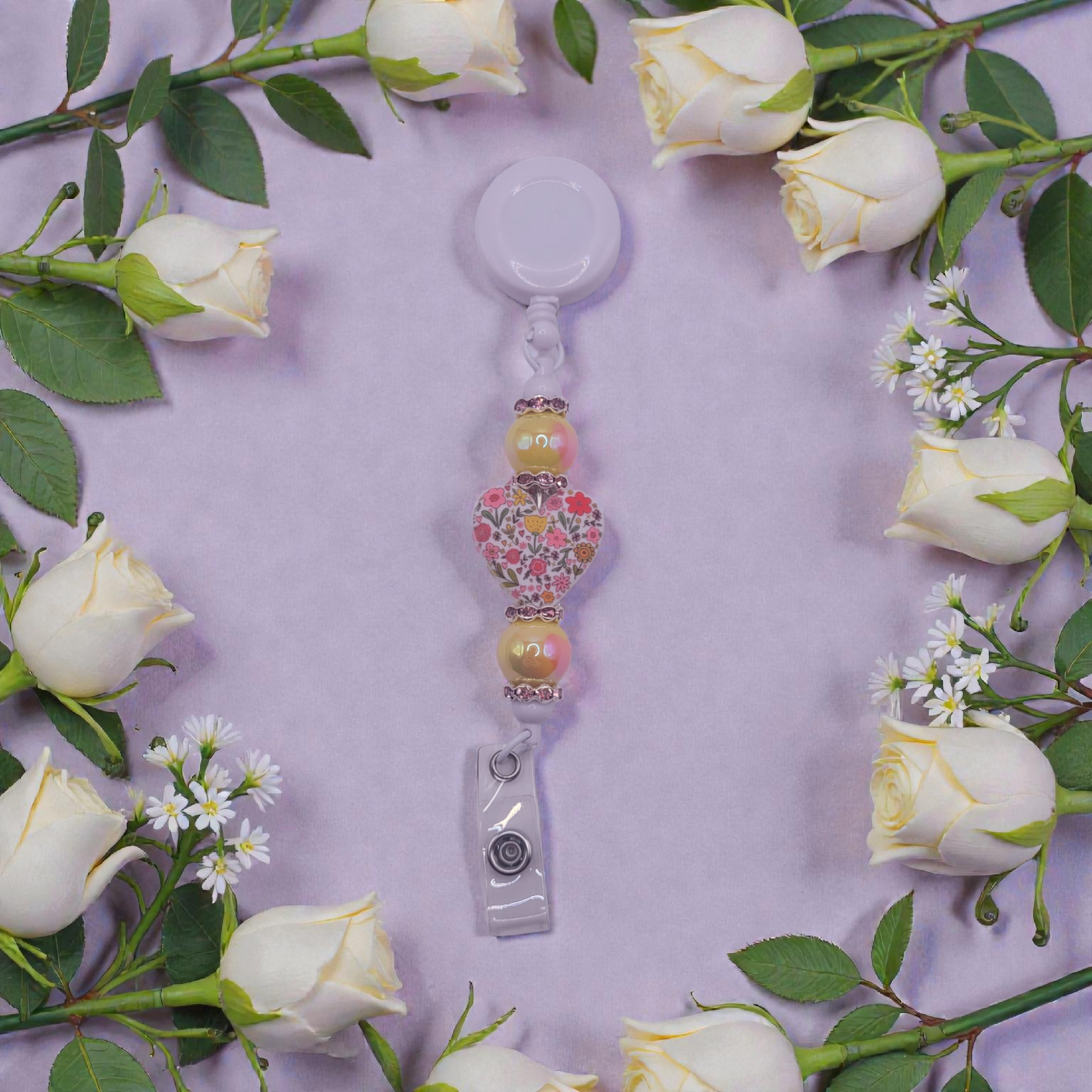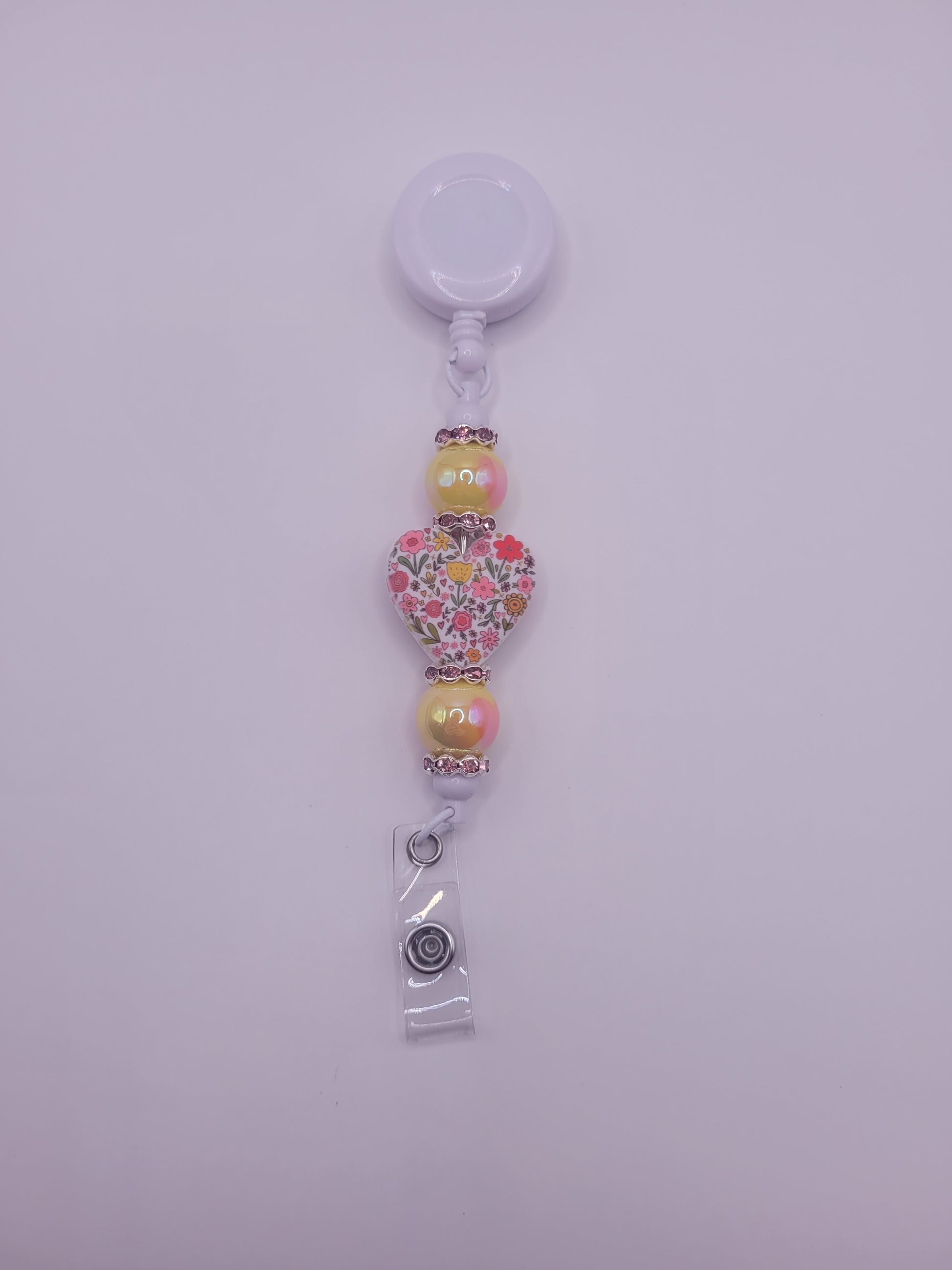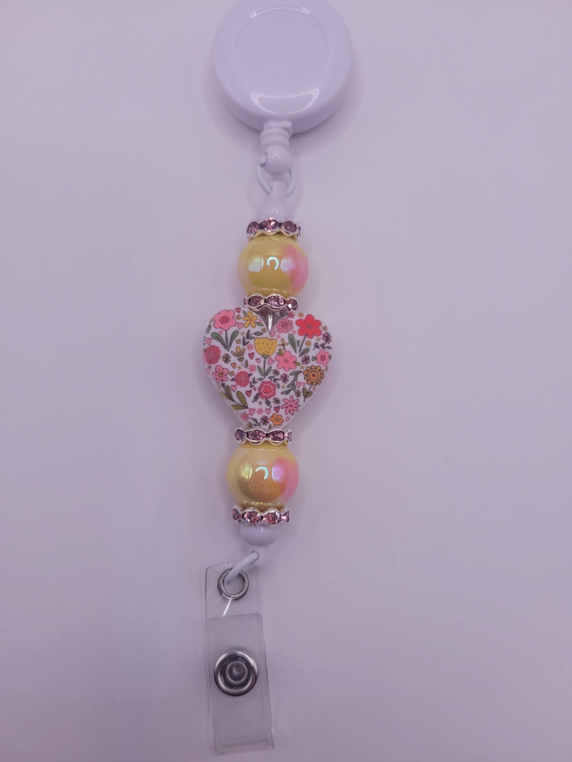 The Blooming Heart badge reel features a white base adorned with a floral heart bead and two yellow heart accent beads. This design offers a visually appealing and professional accessory for ID display, combining functionality with aesthetic appeal. The durable construction ensures reliability in everyday use.