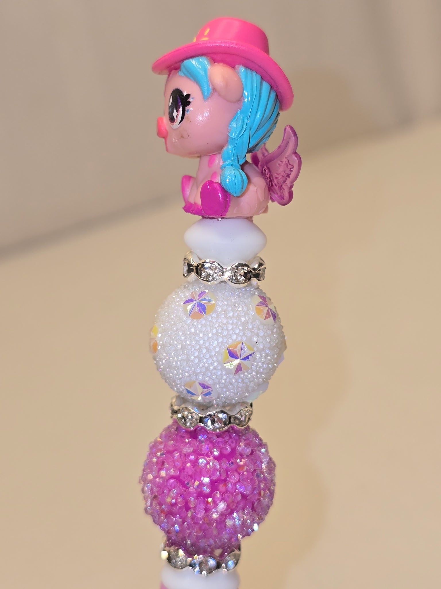 Introducing the Hatchimal Pen, a fun and functional writing tool for fans of these popular characters. The pen features a cute hatchimal character on top and sparkly beads underneath, adding a touch of whimsy to your writing experience. Express your love for hatchimals with every stroke!