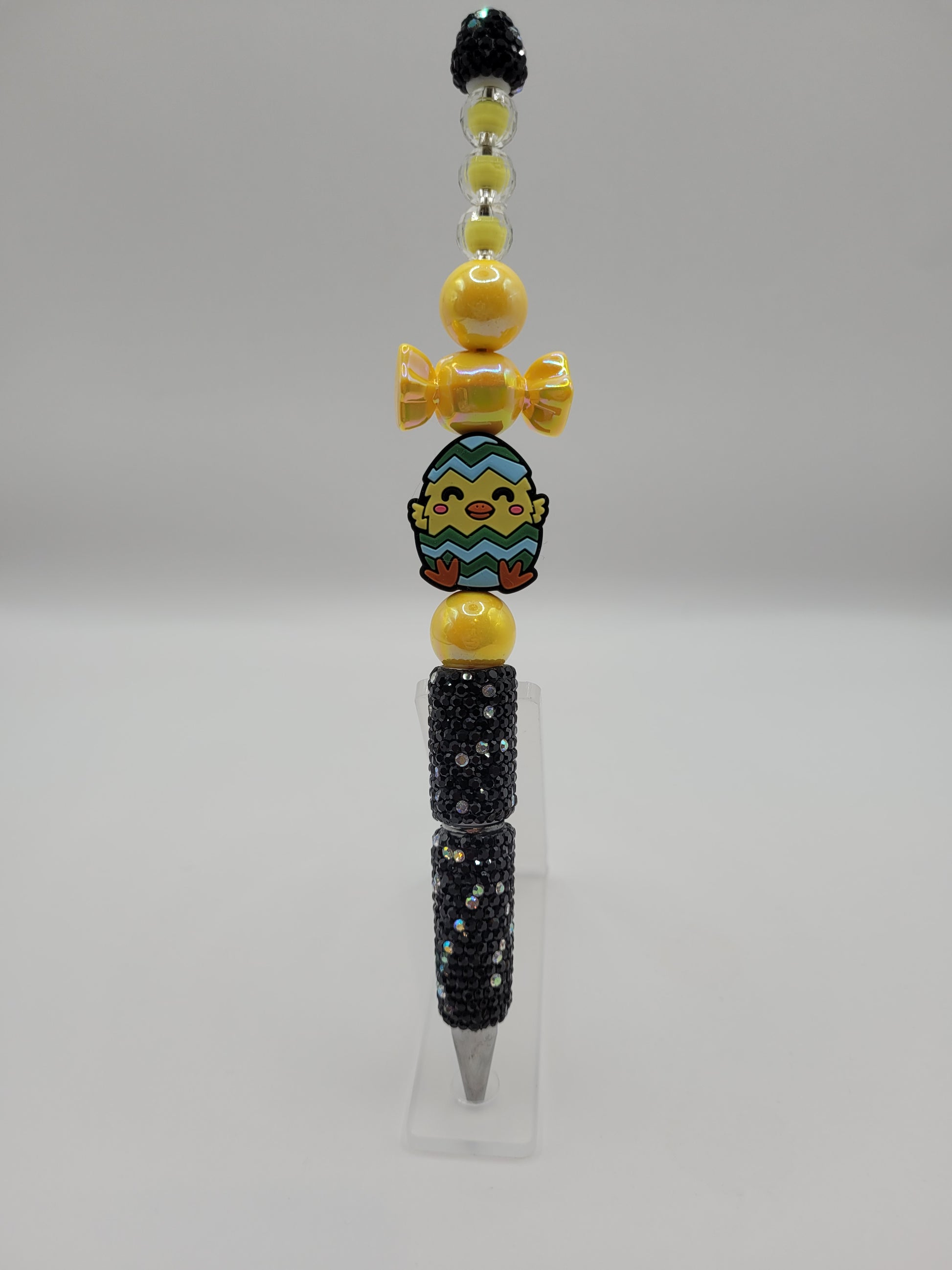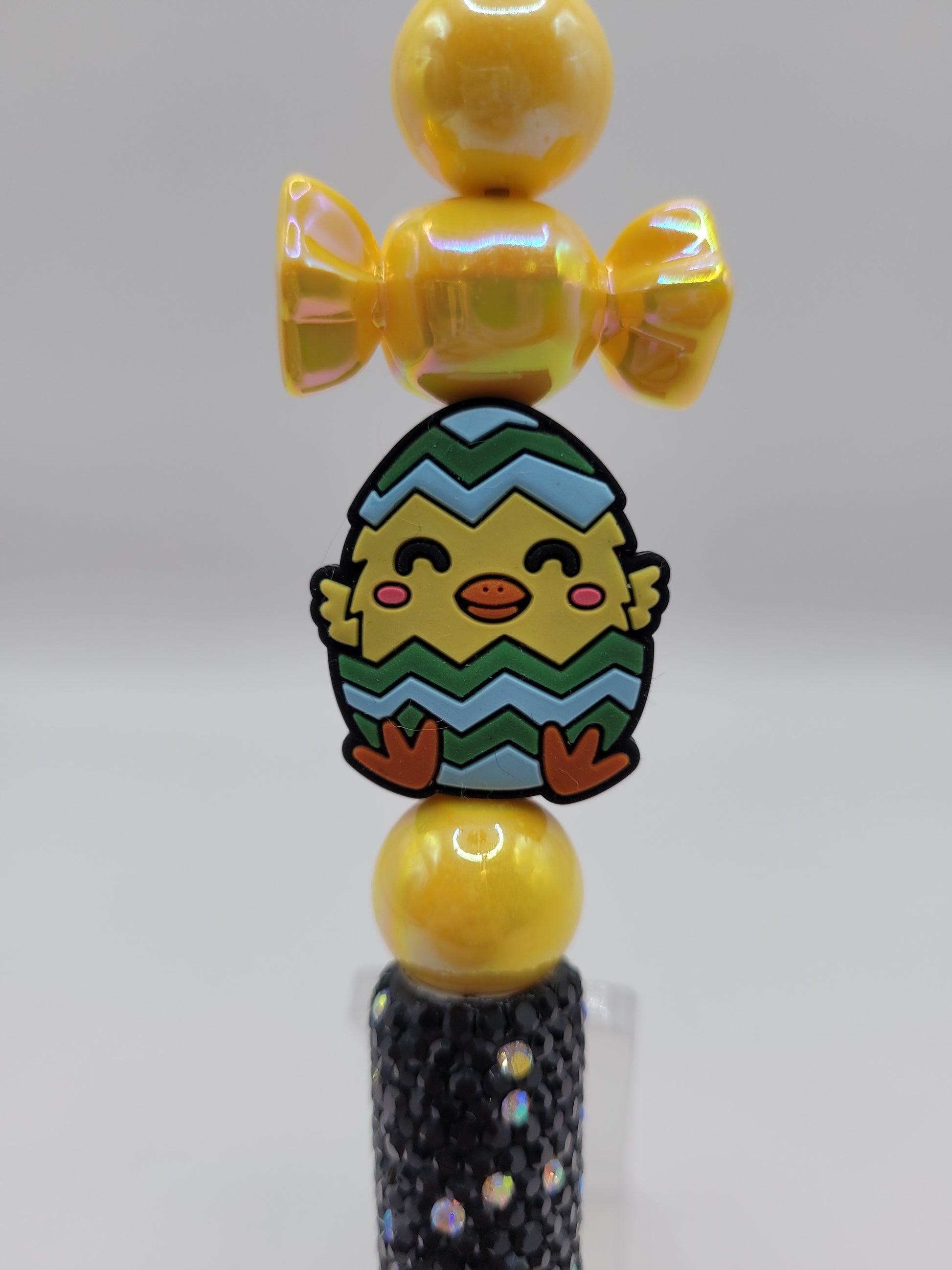 Unleash your inner artist with the Hatching Happiness pen! This snazzy black sparkle wonder is decked out in cheerful yellow beads, topped with an adorable chick hatching from an Easter egg (because who doesn't love a little egg-citement?). Scribble your way to joy—one quirk-tastic note at a time!