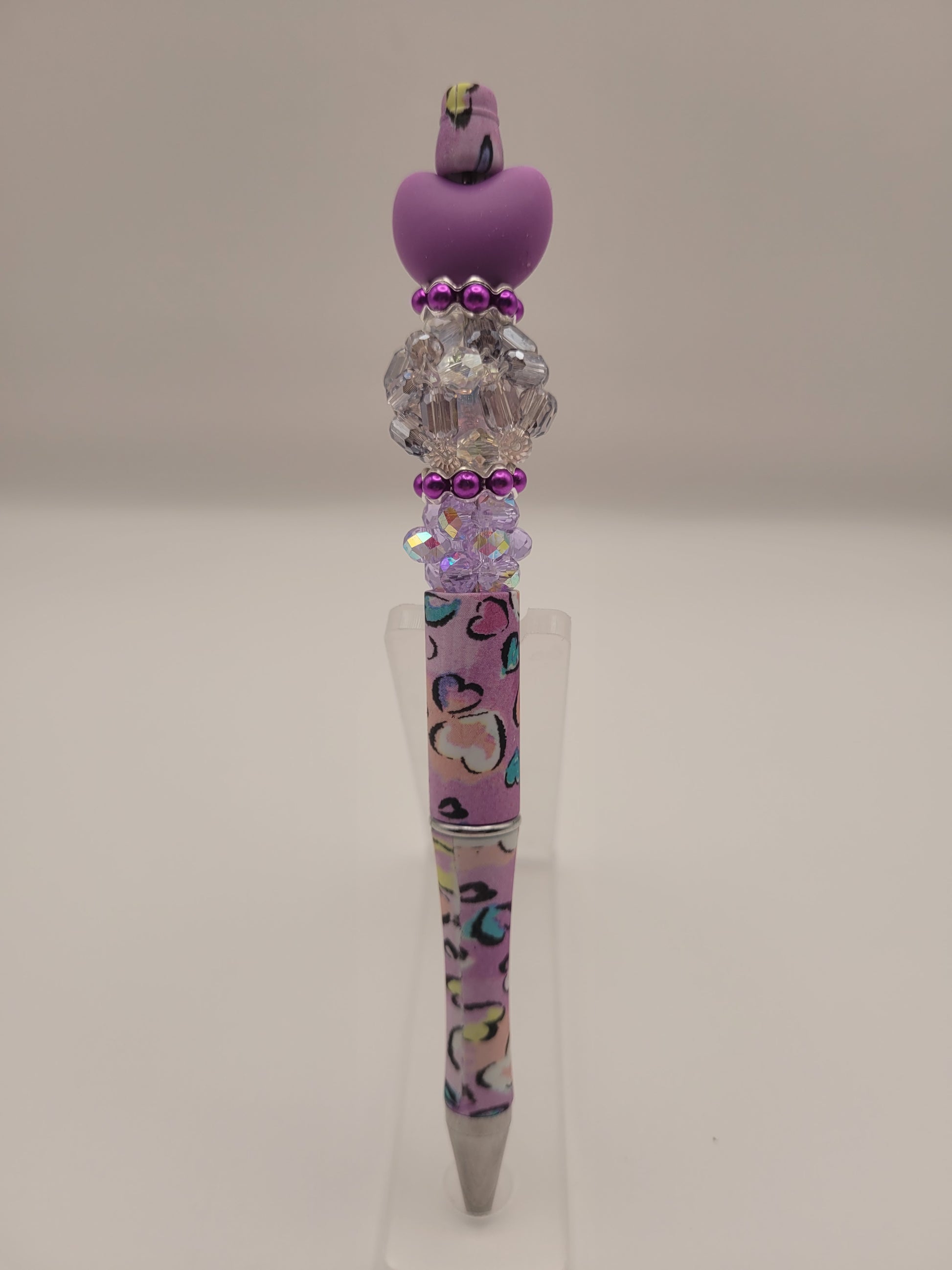 Introducing the Purple Love Pop, a heart-shaped pen featuring a distinctive purple cheetah print design. This writing instrument combines aesthetics with functionality, offering a comfortable grip for extended use. Its unique color scheme and pattern make it a visually appealing addition to any writing set, enhancing the user's experience.