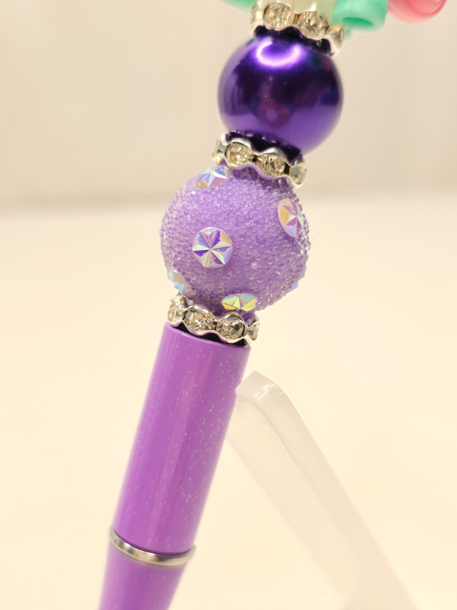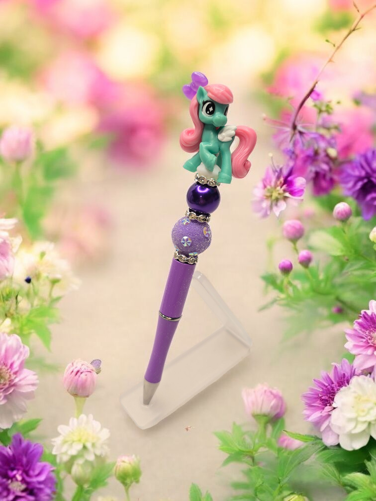 This pen features a charming My Little Pony topper, perfect for any fan or collector. The purple beads underneath add a touch of whimsy to your writing. Makes a great gift for those who appreciate nostalgia and unique pens.