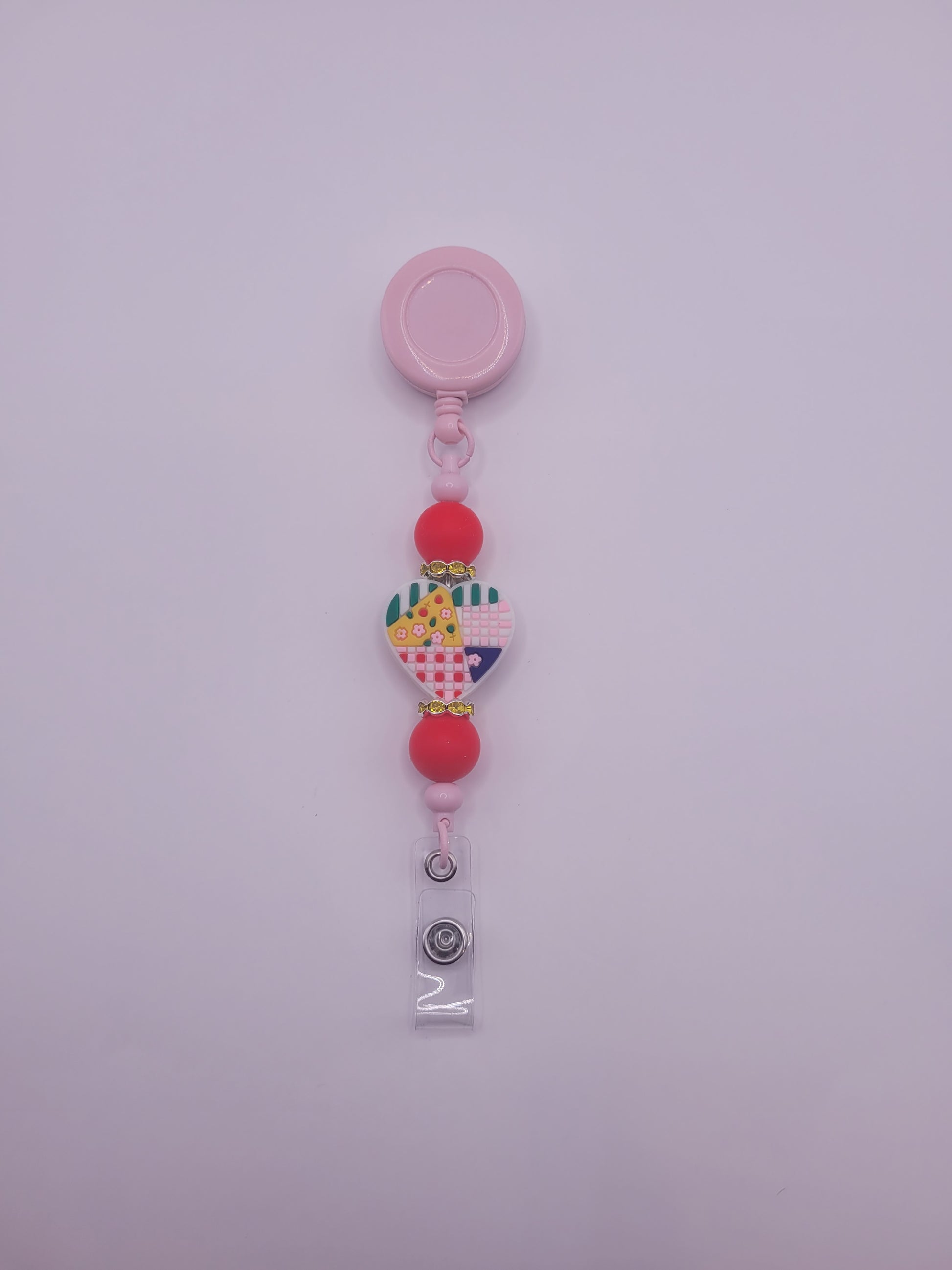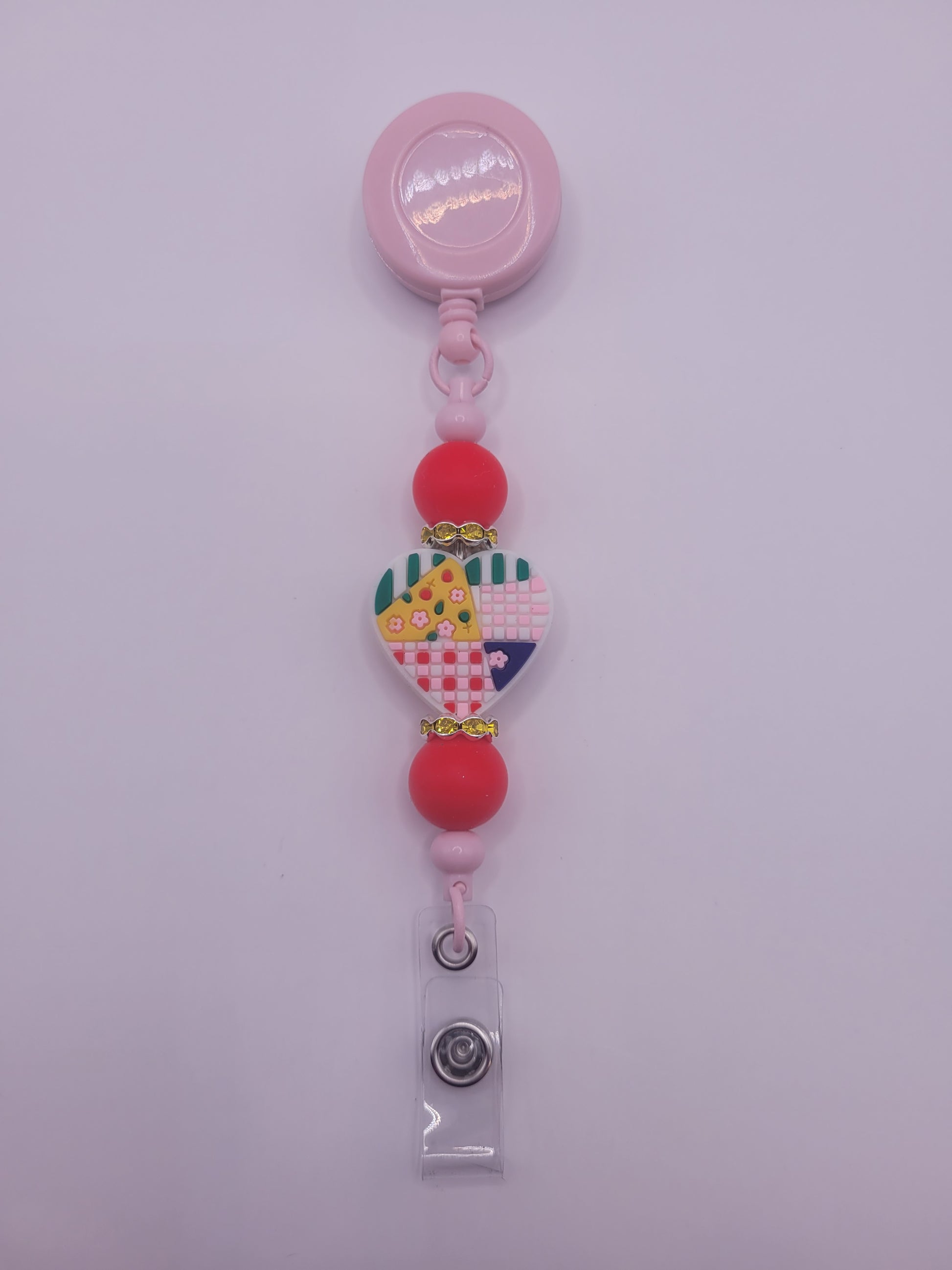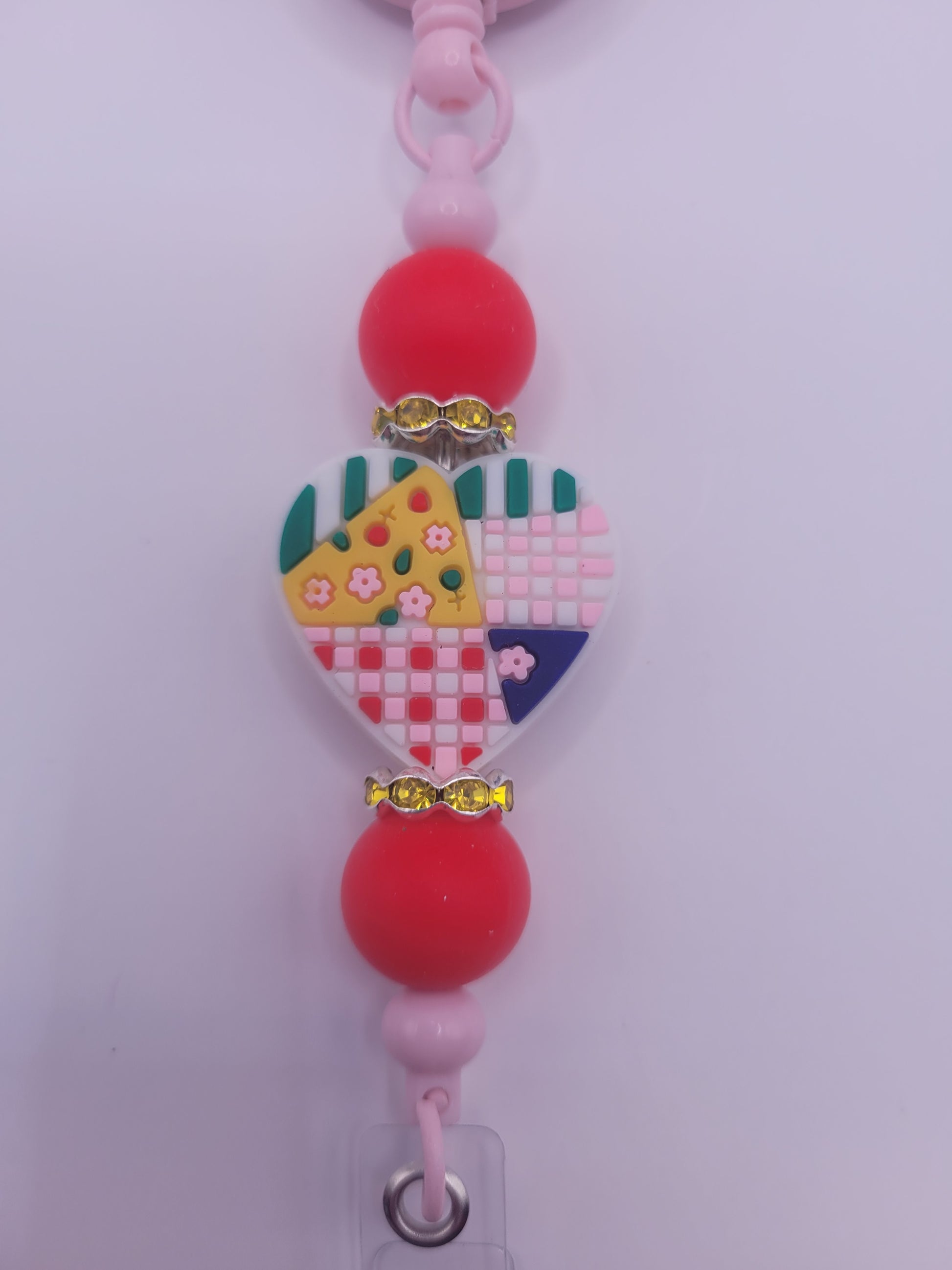 The Walking on Love badge reel features a heart bead design composed of multiple colors, enhancing visual appeal while serving a practical function. Its ergonomic structure ensures ease of use, facilitating quick access to identification badges. This reel is durable, providing reliable performance in various professional settings.