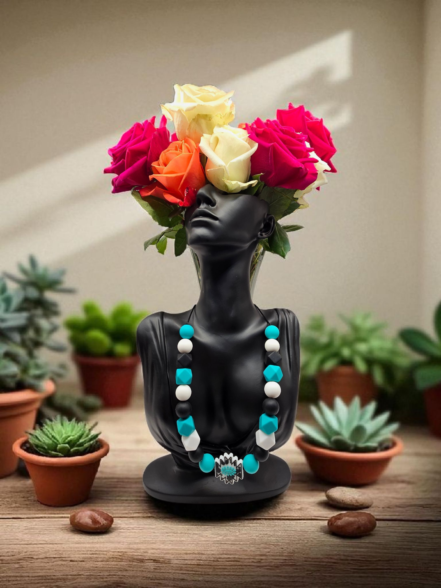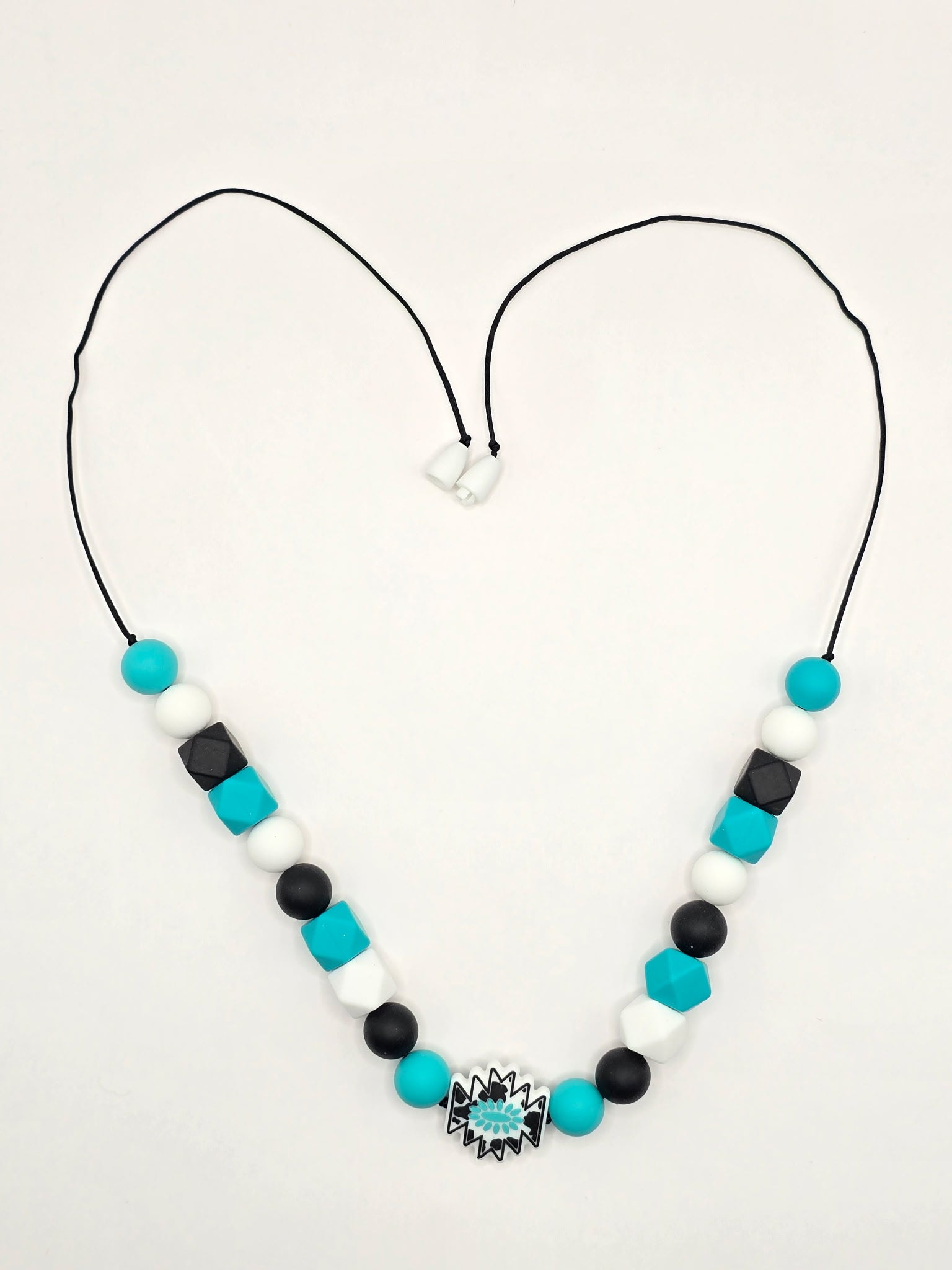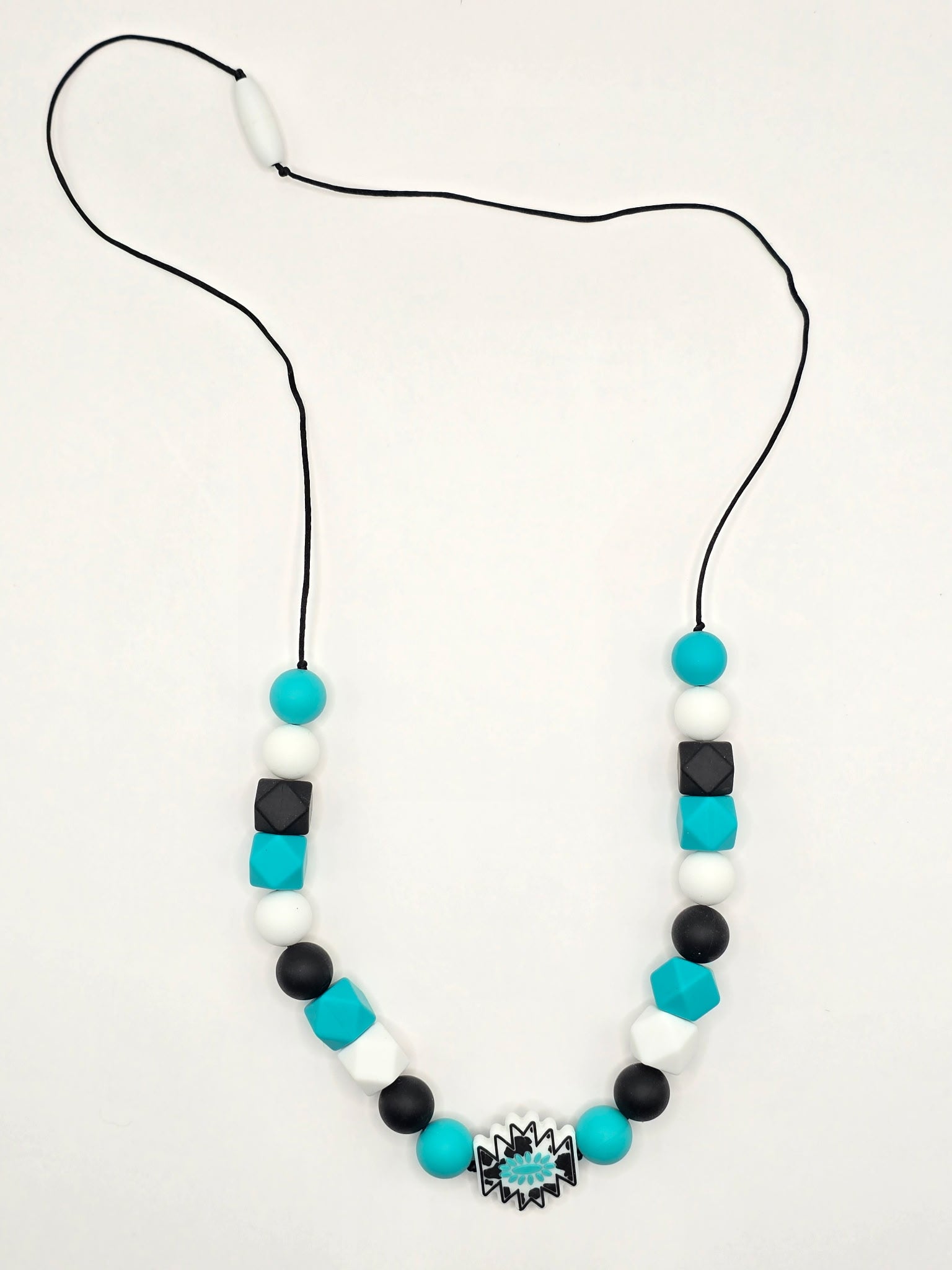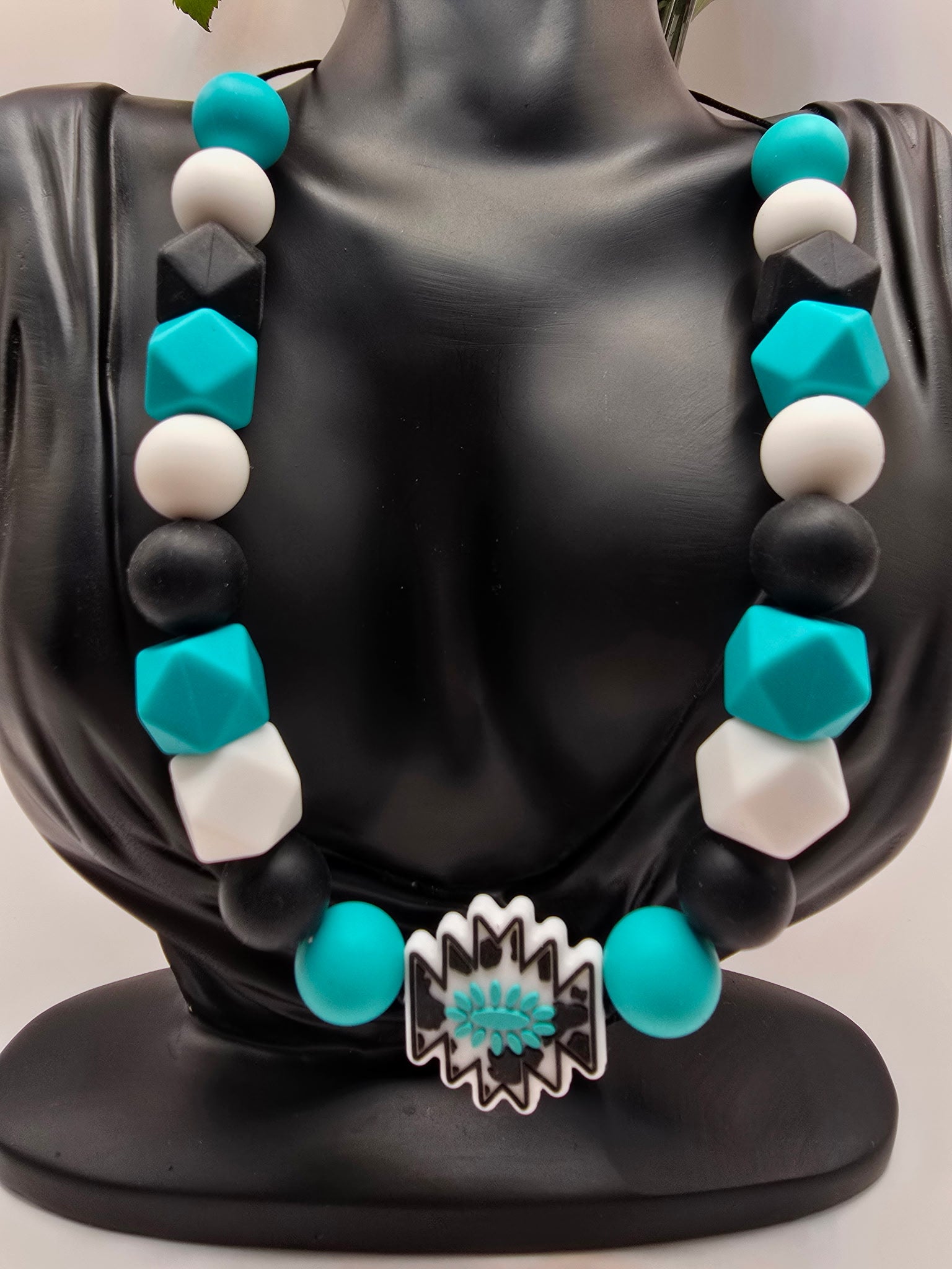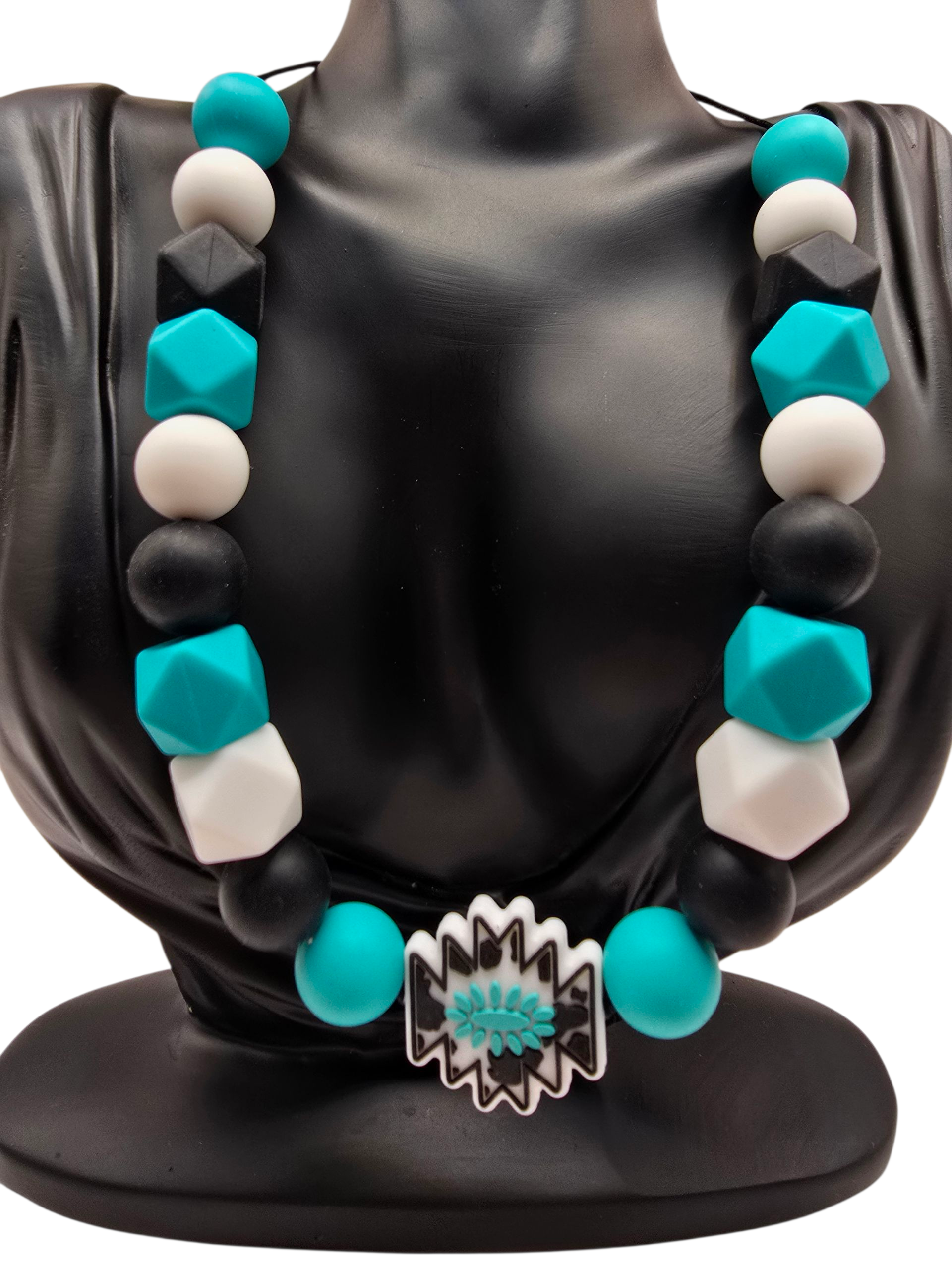 This silicone teething necklace features a Western turquoise style, providing a safe and fashionable option for teething babies. Made with all silicone, this necklace is durable and easy to clean. Give your little one relief from teething discomfort while adding a touch of style to any outfit.